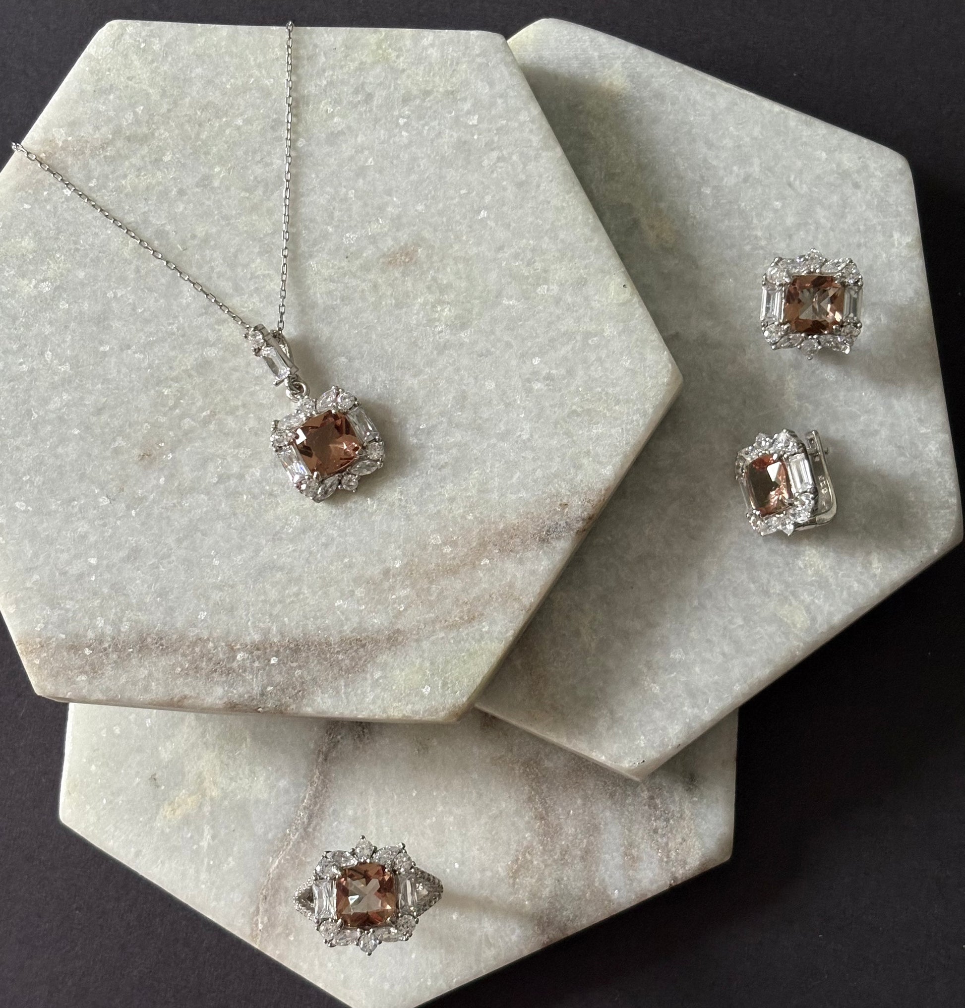The Cello Set showcases square-cut Zultanite stones set in sterling silver, offering a bold yet refined aesthetic. With its clean lines and striking color-changing beauty, this set creates a harmonious balance of sophistication and modern style.