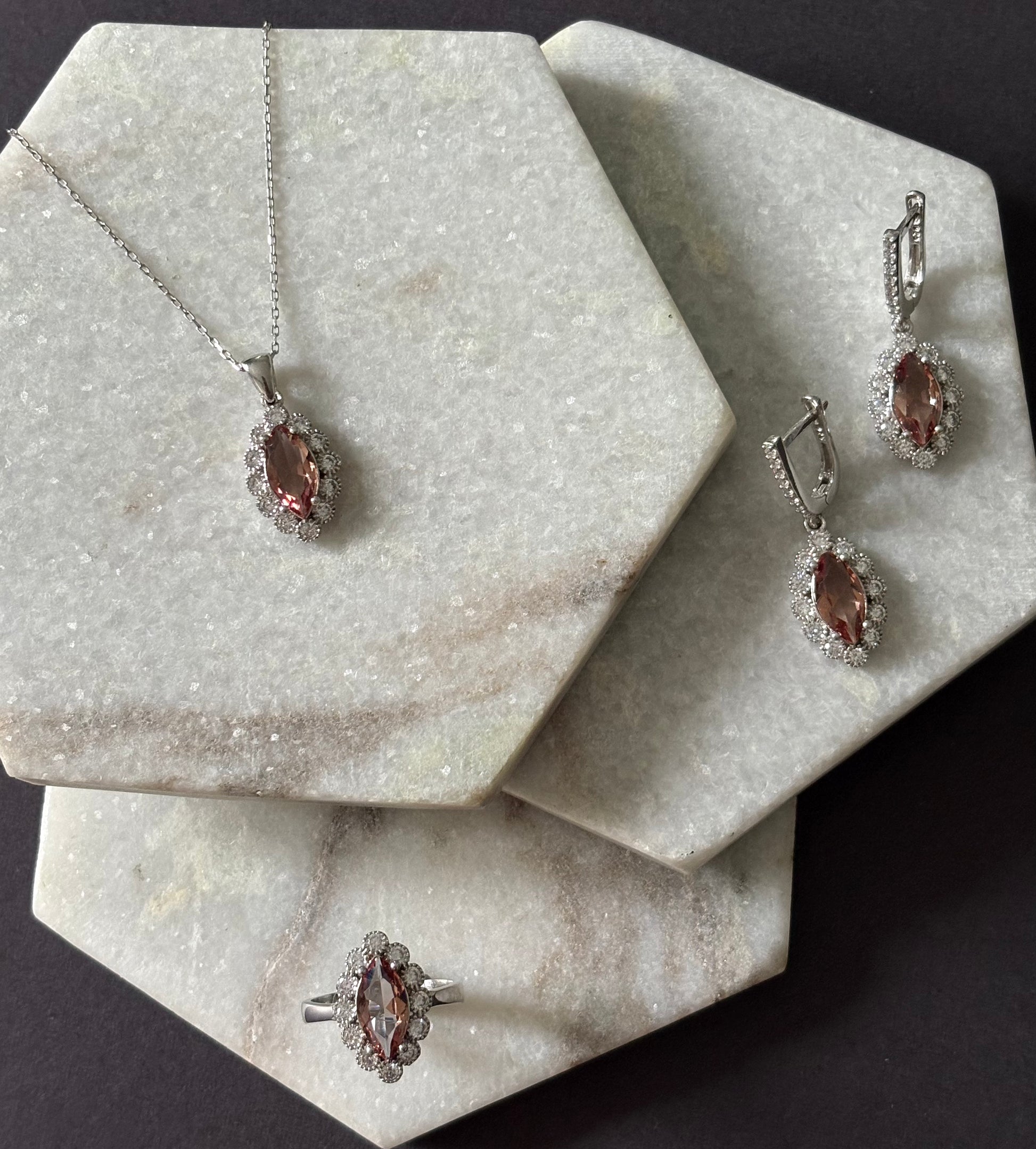 The Mary Set showcases striking marquise-cut Zultanite stones set in premium sterling silver. Defined by its elongated, graceful silhouette, this collection highlights Zultanite’s unique color-changing brilliance, offering a refined balance of elegance and modern sophistication.