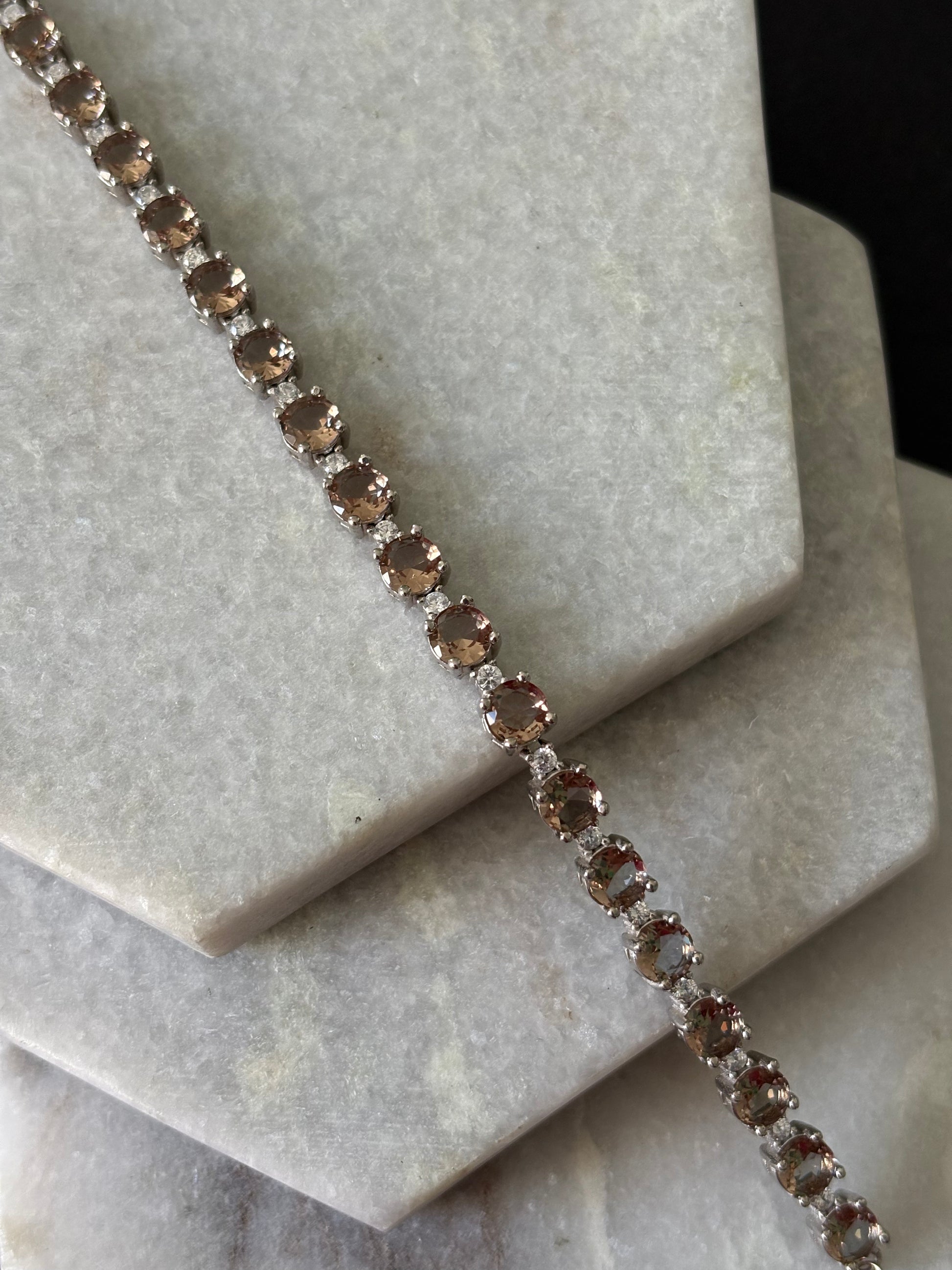 The Tennis Zultanite Bracelet embodies timeless elegance with a continuous line of brilliant Zultanite stones, each shimmering with a mesmerizing play of color—from soft green to warm champagne and blush tones. Expertly set in polished sterling silver, the design offers a perfect blend of sophistication and versatility. Whether worn alone for a refined statement or layered with other pieces, this bracelet radiates effortless luxury and grace.